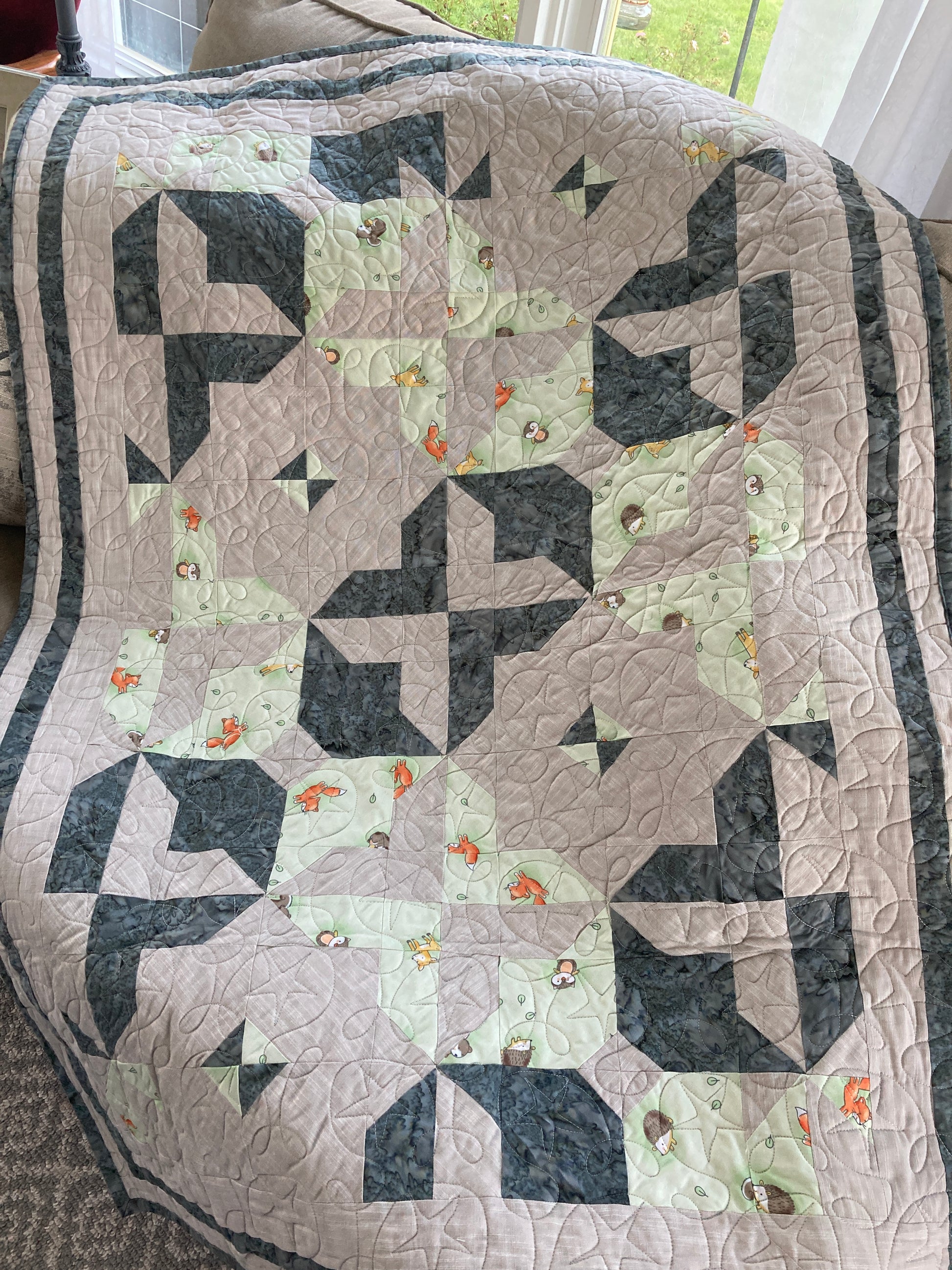 Wrap your tiny human in a beautiful handcrafted quilt featuring woodland critters in neutral green, grey and linen styled cotton. Backed with organic flannel and quilted with stars and swirls, this quilt will fit in with any decor.